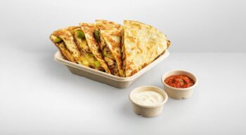 Toasted flour tortilla filled with melted cheese, your choice of filling, sautéed capsicum, and onion, served with sour cream and your choice of salsa on the side.